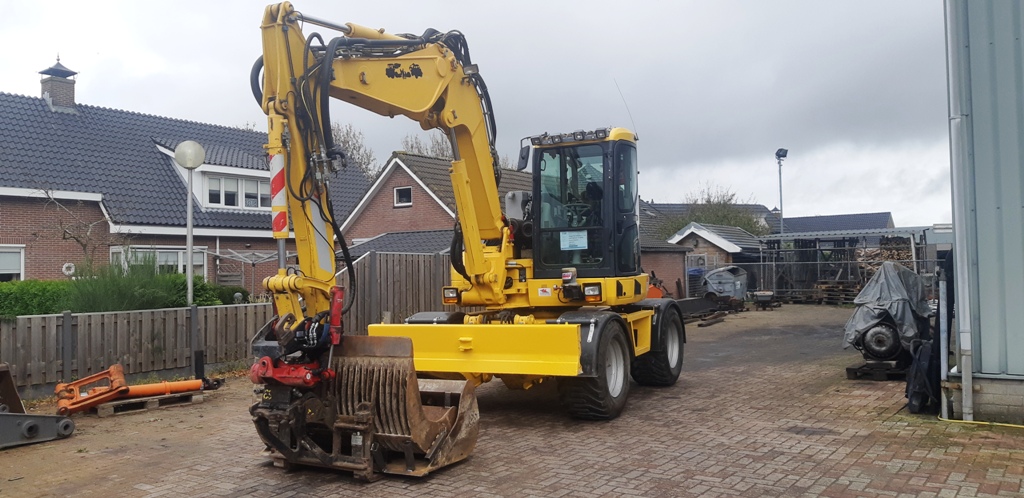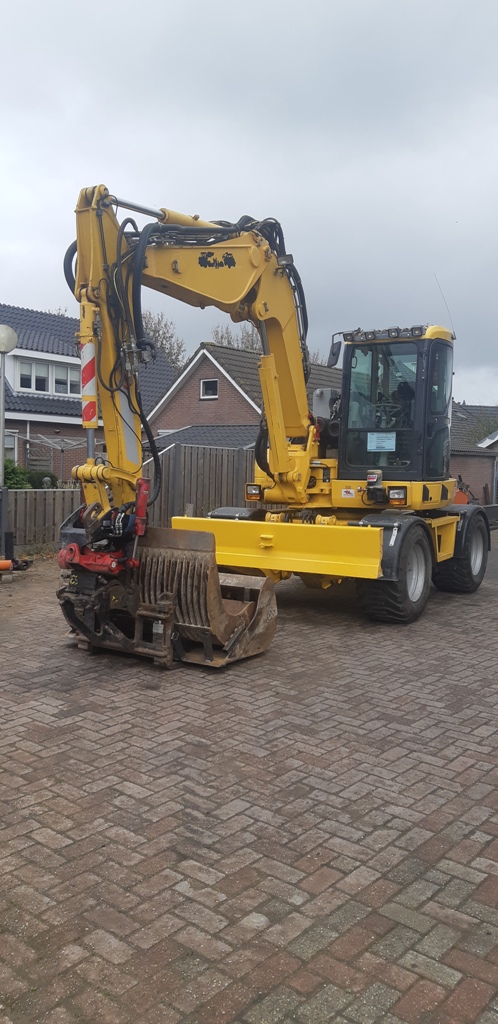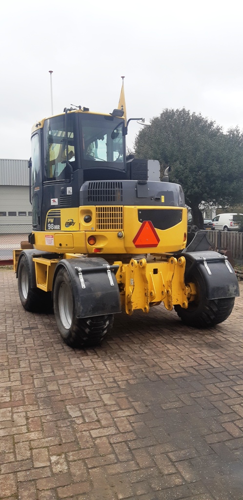 De Komatsu PC98SR werd voorzien van een draaikantelstuk en een WOS vacuum unit.