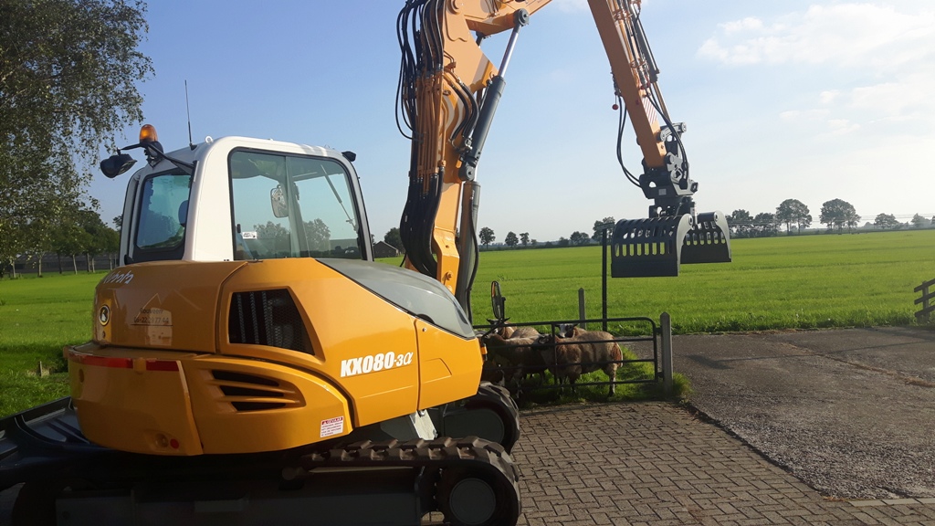 De sorteergrijper wordt gebruikt aan de Kubota KX080-3 van de firma Hengsteboer voor onder ander het slopen van beschoeiingen.